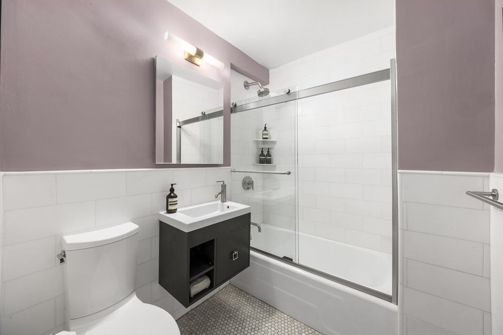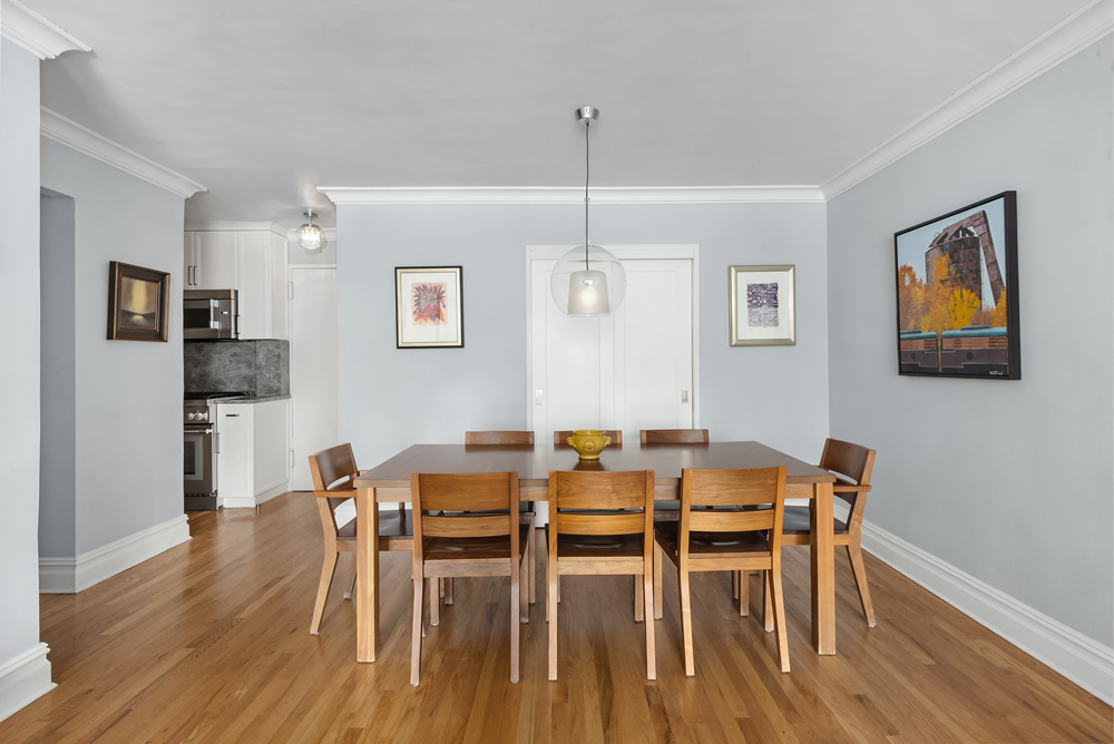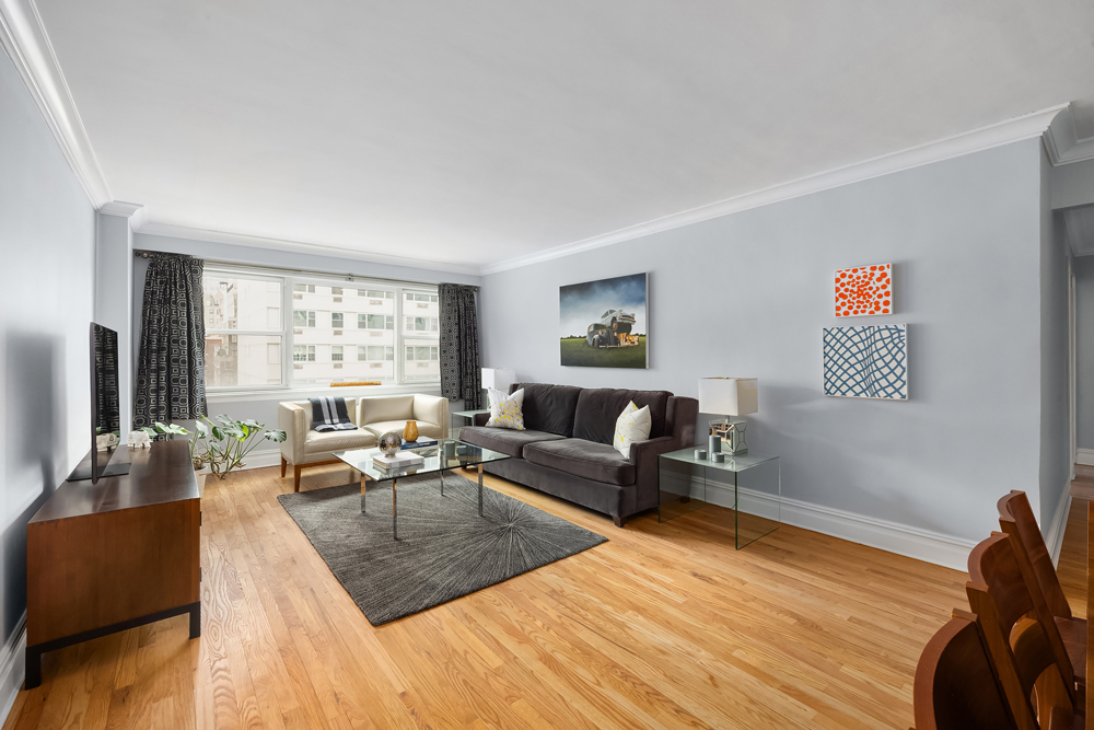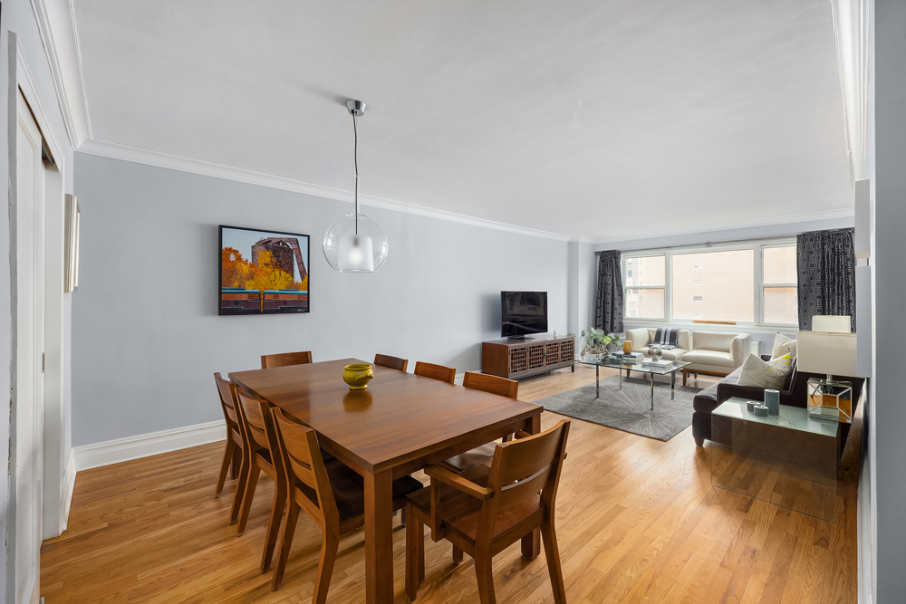 An entry foyer and adjacent coat closet provides a warm entry leading into a sun-filled, east-facing living room with open views over Sixth Avenue. A full wall of windows brings excellent morning light, while the generously scaled layout easily accommodates oversized living and dining furniture, ideal for both everyday comfort and entertaining.