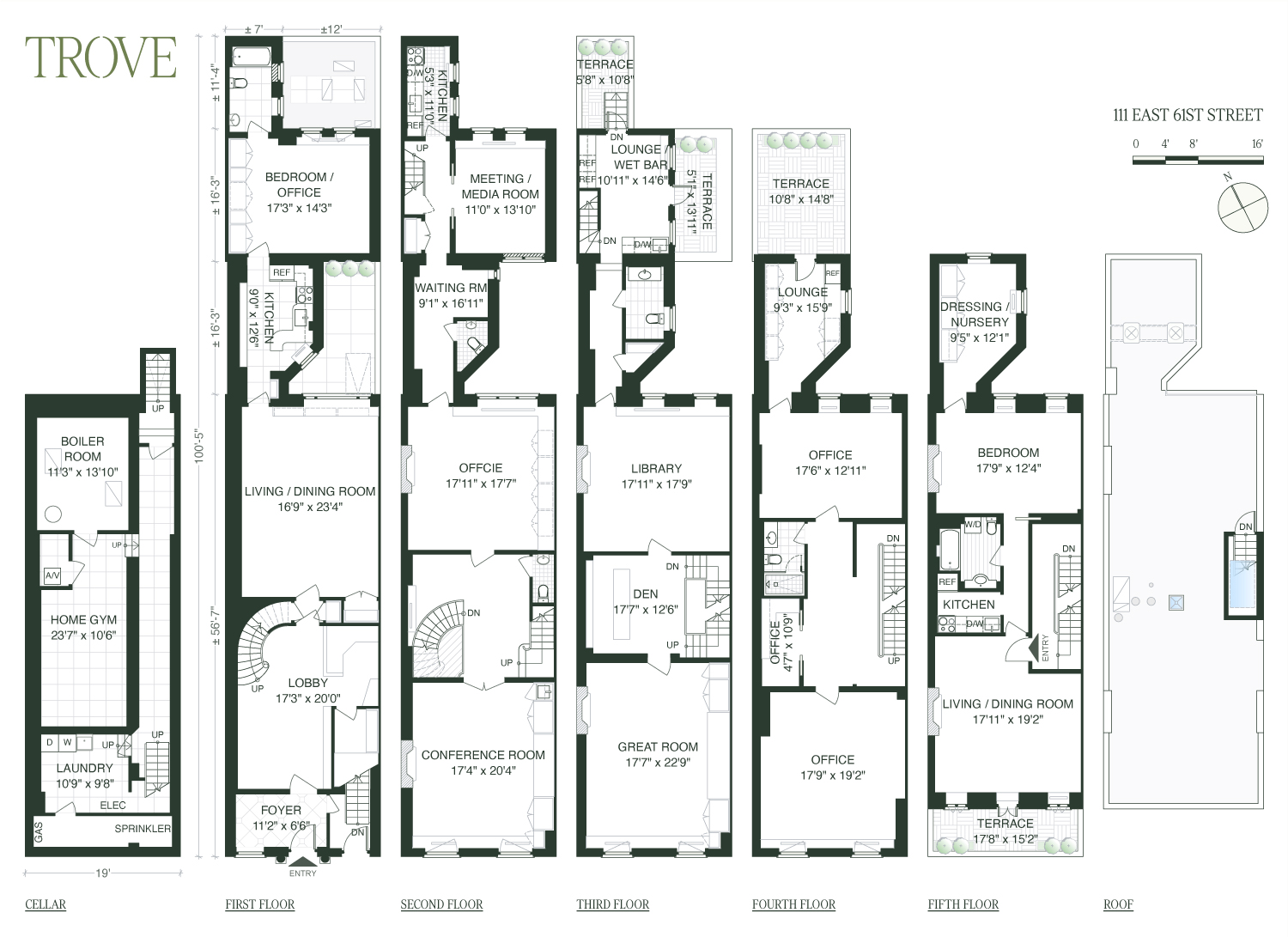 On the second floor the ceilings are very high and there are two powder rooms as well as a full kitchen. The third and fourth floors were most recently leased as offices, but currently vacant. There is an additional renovated kitchen on the third floor, a renovated powder room, and two planted outdoor terraces, as well as an additional large terrace off of the back of the fourth floor.