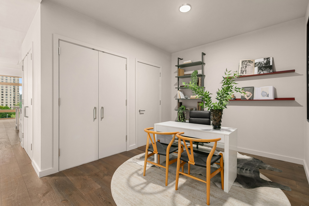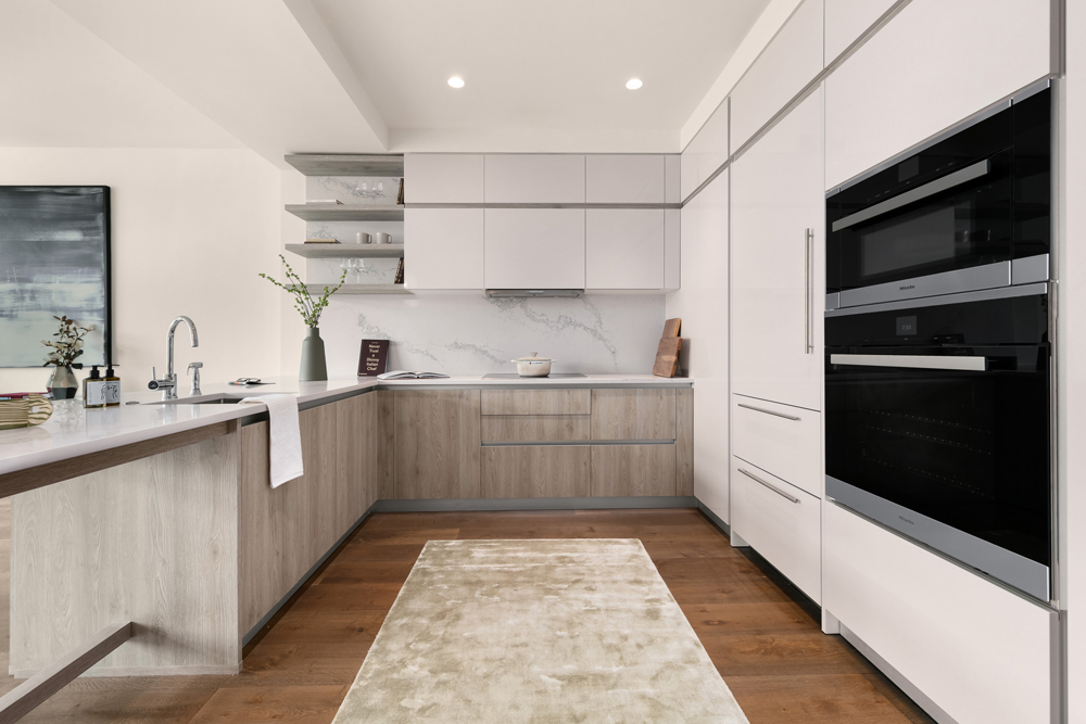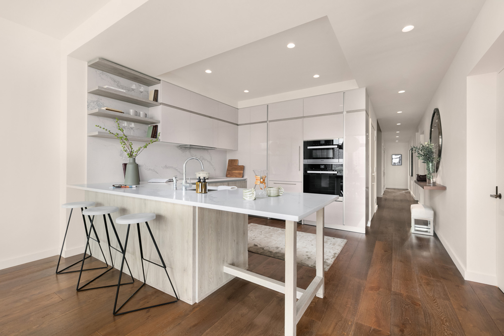 Each apartment boasts an array of high-end fixtures and finishes the stunning kitchens are equipped with eat-in peninsulas, statuary quartz countertops, a matching backsplash, custom Italian cabinetry, pantry space by ALTA, and a suite of fully-integrated Miele appliances.