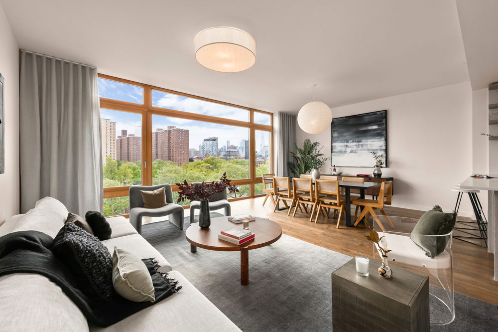 The open-concept living areas are south-facing and imbued with natural light, making them perfect for the seamless transitions of the contemporary lifestyle. The living areas feature French white oak floors and tripled-paned floor-to-ceiling windows with Siberian larch framing, providing dramatic unimpeded views of Lower Manhattan.