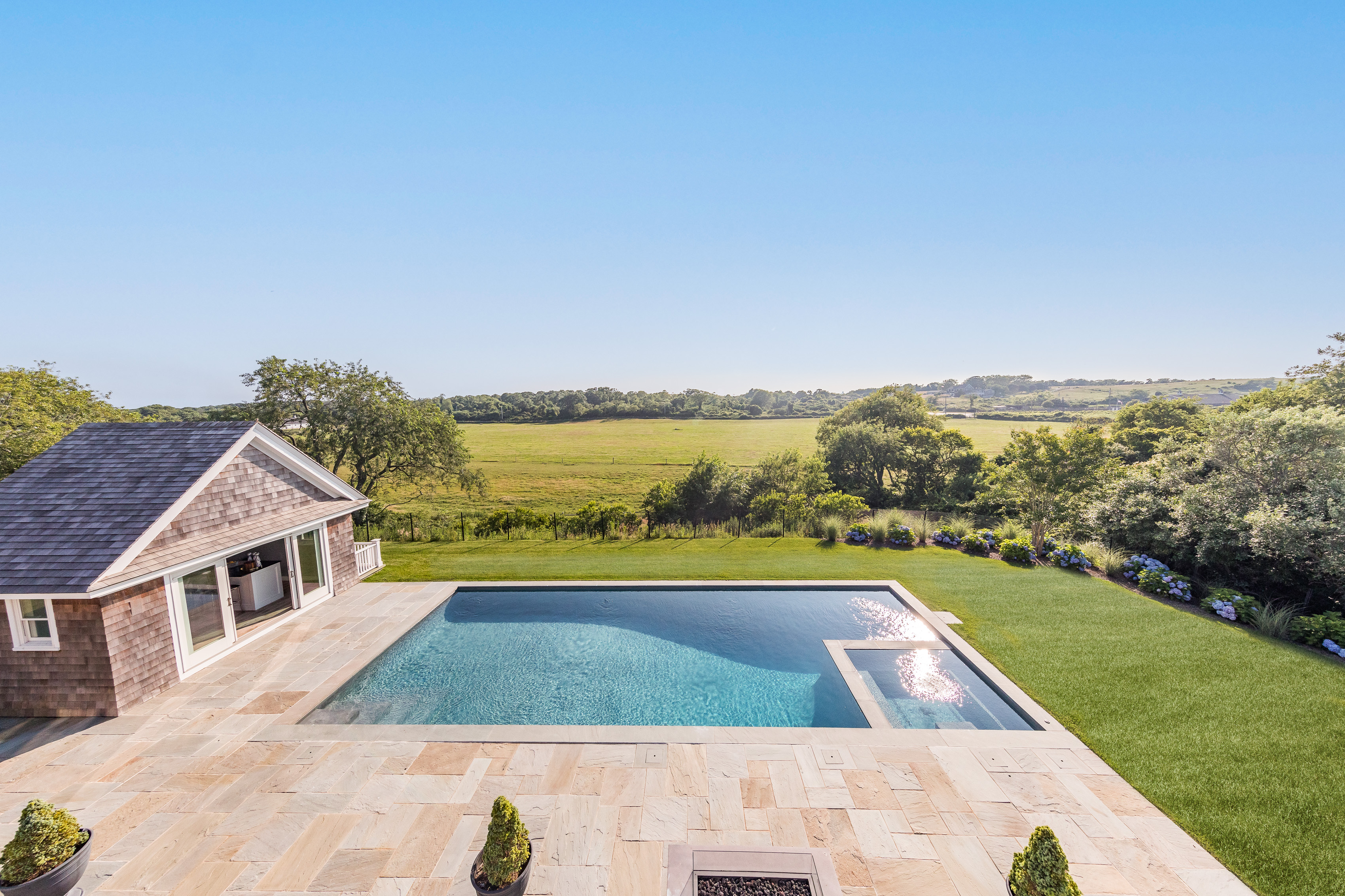 Indulge in breathtaking sunsets and unparalleled opulence at this flawlessly crafted traditional residence nestled on a picturesque 1.58-acre property. Positioned atop the Old Montauk Highway hillside with unobstructed vistas overlooking Deep Hollow Ranch, this private sanctuary offers an exceptional retreat in one of the most sought-after locations in Montauk.Few newly built properties in Montauk rival the tranquility of this exquisite 4 bedroom, 6.5 bathroom masterpiece, showcasing remarkable interiors, an outdoor fireplace, a saltwater pool and pool house for an idyllic resort-style experience.Step into this elegant cedar shake home to discover a bright and spacious modern floor plan spanning 5,054 square feet, meticulously designed with every detail in mind. The great room centerpiece features a majestic floor-to-ceiling brick fireplace. With soaring double-height ceilings and a wall of sliding glass doors for seamless indoor-outdoor entertaining.The striking gourmet kitchen is adorned with high-end appliances and custom cabinetry.Mix craft cocktails on the expansive marble island and enjoy meals in the sophisticated dining room with easy access to the screened-in porch. Completing the main level is a private den area with direct outdoor access, and a luxurious primary bedroom suite boasting a vaulted ceiling, glass doors leading to the outdoor oasis, and a stunning spa-like en-suite bathroom with dual sinks and an enormous glass-enclosed shower. Upstairs, you'll find additional king-sized sleeping quarters, including a second master bedroom suite with a spectacular bath featuring an oval soaking tub, along with two guest bedroom suites, each with their own stunning full bathrooms and walk-out decks. As an added bonus, a separate office suite with queen-size pullout sofa provides a bright, open loft-like space, offering a welcomed sense of privacy.The fully renovated spacious lower level features a state-of-the-art screening area, pool table and a full bar, providing the perfect setting for hosting memorable parties and events. Additionally, a fully equipped gym with punching bag and sauna awaits fitness enthusiasts, offering the ultimate in convenience and relaxation.Whether you desire to immerse yourself in Montauk's rich culture, or soak in the dramatic beauty of the rugged cliffs along the shoreline, Montauk offers a distinctive lifestyle. Known as a haven for renowned artists such as Andy Warhol, Julian Schnabel, and Peter Beard, this coastal town is truly unparalleled. Secluded and exclusive, this turnkey gem is ready to become your own personal paradise.