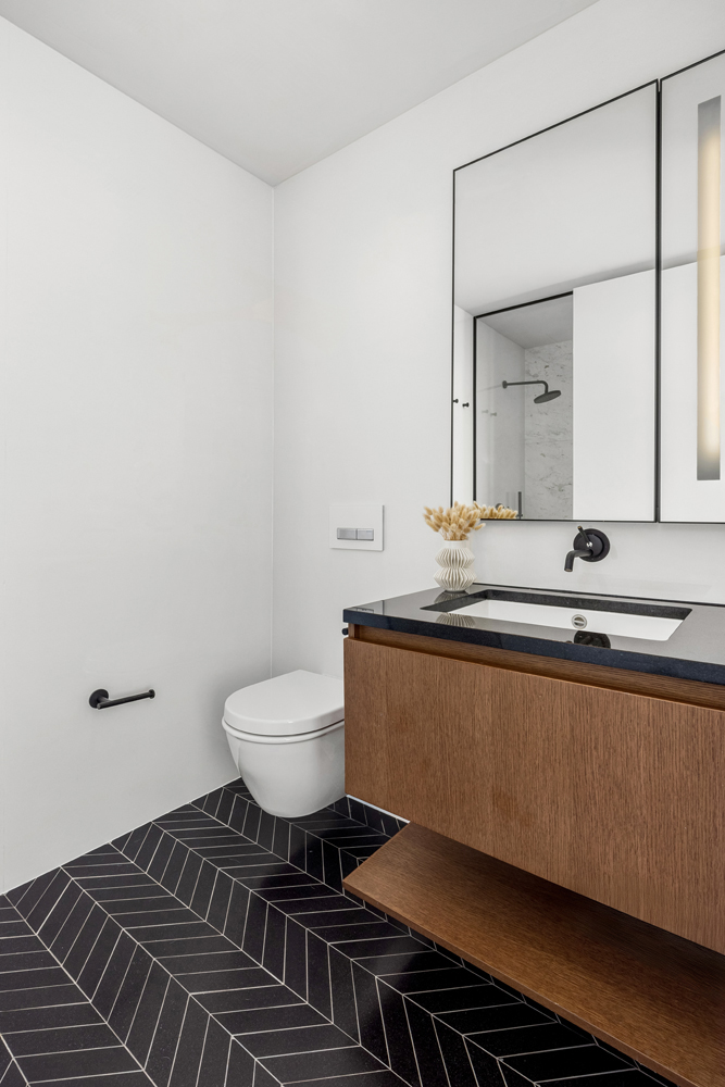 Awake to sunny south-facing views of One World Trade and the harbor in the serene primary suite featuring a king-size layout and customized, lit walk-in closet – all bedroom closets are custom/lit. The lavish en suite bathroom impresses with a soaking tub, shower and custom double vanity wrapped in beautifully curated marble, black matte Zucchetti fixtures and radiant heat floors in all bathrooms. A secondary, north-facing suite in this wing boasts an en-suite bathroom. Off the great room, you'll find another secondary bedroom and a well-appointed guest bathroom. Four-pipe heating and cooling and a full-sized vented washer-dryer add comfort and convenience to this masterful penthouse sanctuary.