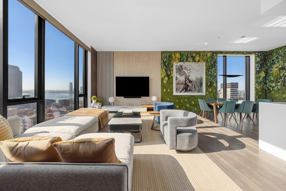 Spanning approximately 2,150 square feet (to be verified by purchaser), this loft-like showplace greets you with soaring ceilings, 8-inch-wide solid oak flooring and floor-to-ceiling windows framing postcard vistas to the north, west and south. Keyed elevator access ushers you to the corner great room, the ideal destination for comfortable relaxation and memorable entertaining alongside silhouettes of the entire New York City skyline. Chefs will delight in the open SOM-designed kitchen filled with Lineadecor walnut-stained cabinetry, Corian countertops/integrated sink, and upscale appliances, including touch screen Miele oven/microwave/convection, Miele five-burner gas range, cabinet-front integrated refrigerator, dishwasher and wine refrigerator. Google home voice activated: 5 zone nest heating/cooling, blinds, all lights, music.