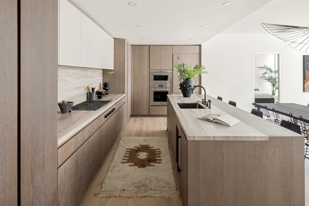Each kitchen is carefully considered with generous open plan layouts that seamlessly integrate the kitchen-living space. The heart of the home, the kitchen features a honed marble Didimon kitchen island, backsplash and countertop, custom-stained rift cut white oak cabinetry, matte dark bronze Graff fittings, state-of-the-art fully integrated Thermador and Wolf appliances, wine refrigerator, and bespoke detailing throughout.