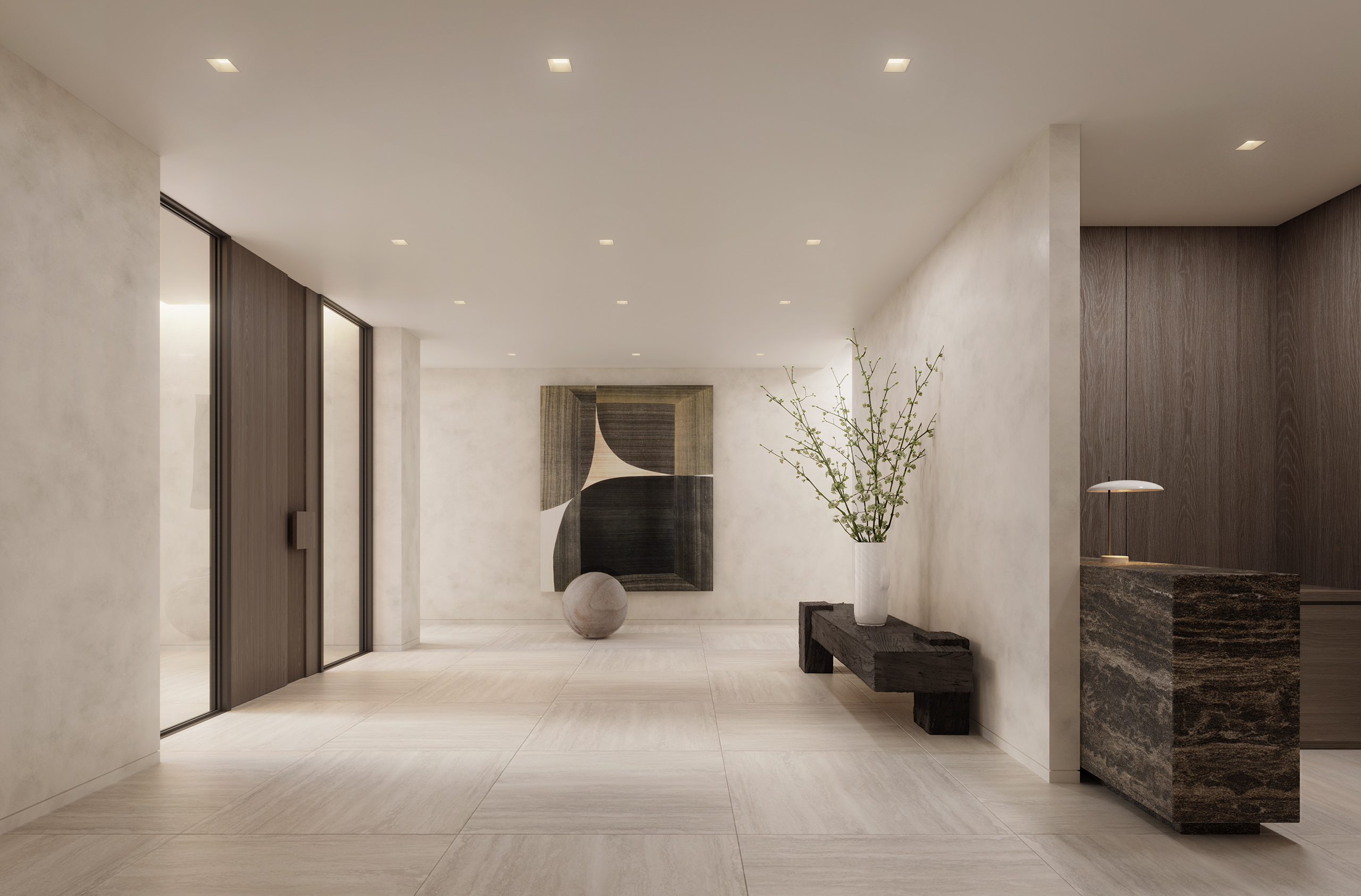 Each kitchen is carefully considered with generous open plan layouts that seamlessly integrate the kitchen-living space. The heart of the home, the kitchen features a honed marble Didimon kitchen island, backsplash and countertop, custom-stained rift cut white oak cabinetry, matte dark bronze Graff fittings, state-of-the-art fully integrated Thermador and Wolf appliances, wine refrigerator, and bespoke detailing throughout.