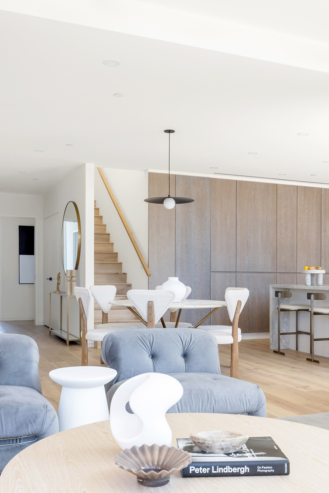The kitchen is designed for both function and style, featuring honed Dolce Vita stone on the island, backsplash, and countertops. Custom-stained flat cut white oak cabinetry pairs with matte dark bronze Dornbracht fixtures, while integrated Thermador and Wolf appliances— including a built-in gas grill, cooktop, electric oven, speed oven, wine refrigerator, undercounter refrigerator, and microwave—make the kitchen well-equipped for everyday use or hosting.