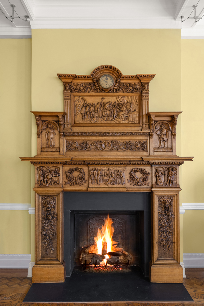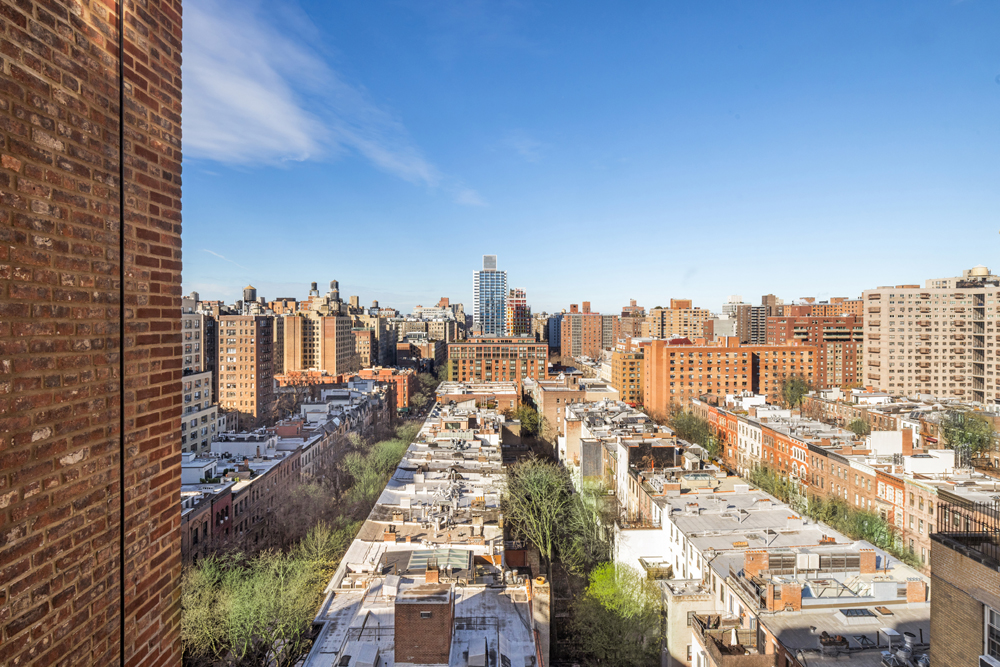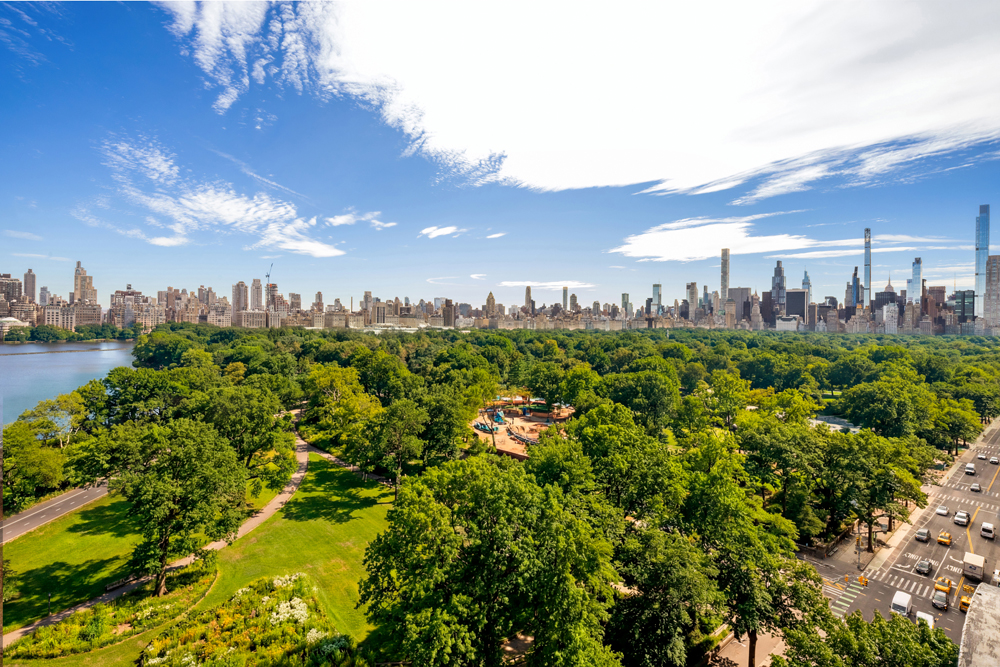The upper level is a sanctuary of light and air. The primary suite, featuring a luxe bath and dressing area, joins a library, office, and a corner den with a wood-burning fireplace. Glass doors open to the impeccably landscaped terrace, offering sweeping views of the Park, skyline, and river—a private oasis above the city.