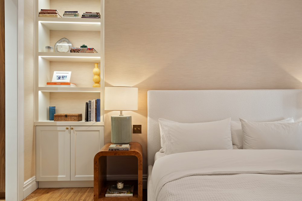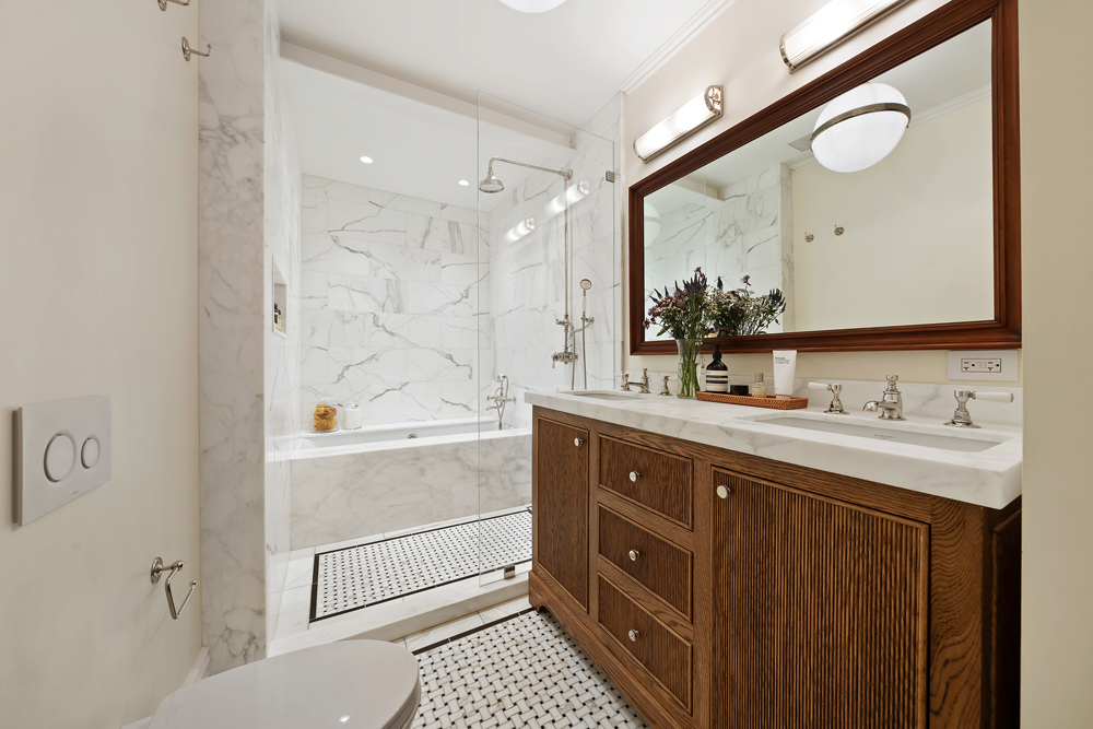 Retreat to the tranquil primary suite, complete with a luxurious en-suite bathroom featuring Waterworks fixtures, exquisite Calacatta Gold Marble counters, and heated marble basketweave tile floors. Custom fabric-lined millwork closets and built-in bookshelves complete with integrated lighting offer plenty of closet space for all your storage needs. The second bedroom offers flexibility as a guest room, home office, or cozy den.