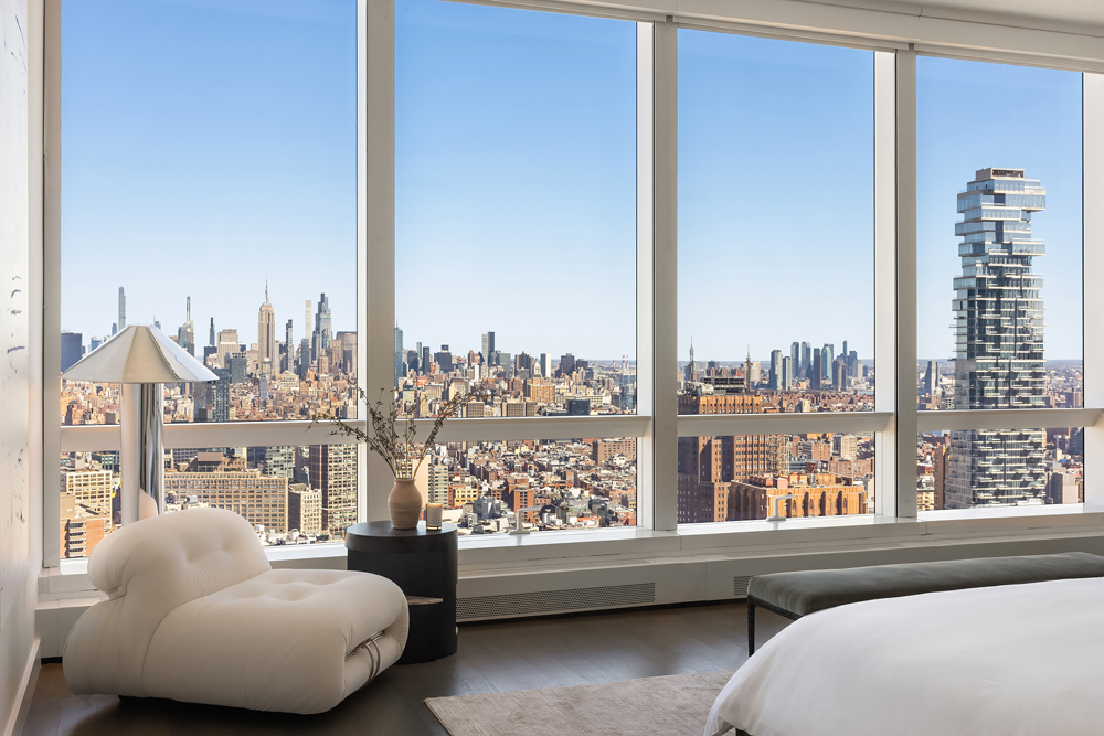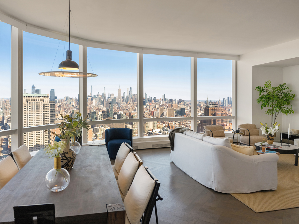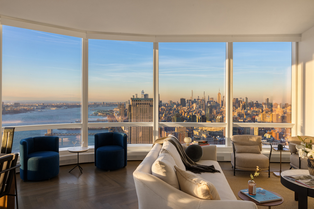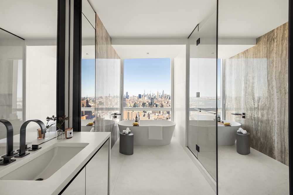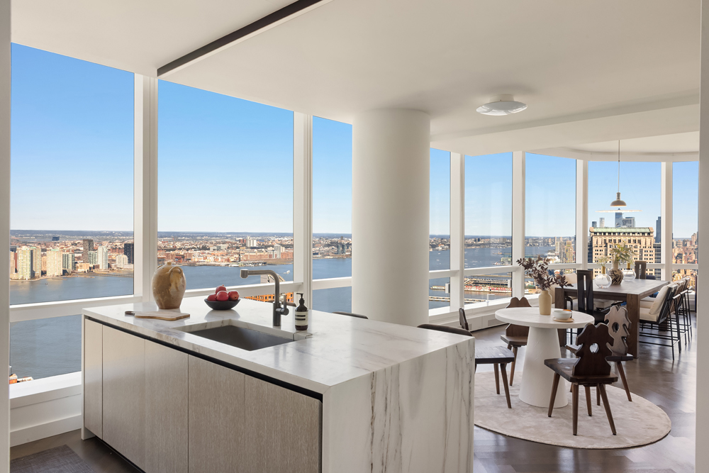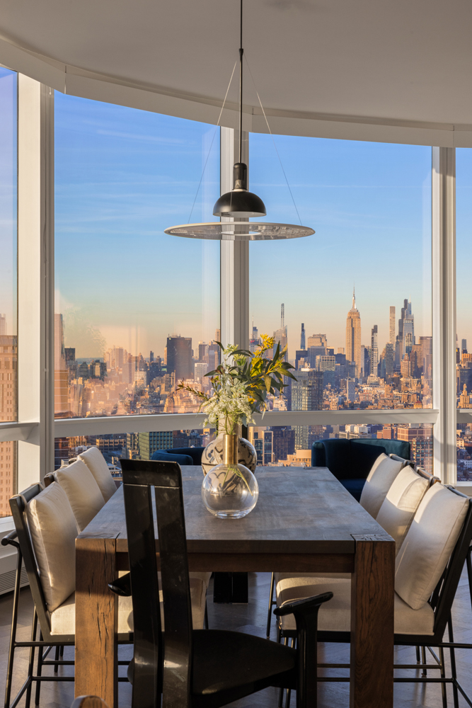 From a private elevator vestibule, a grand set of double doors reveals a formal entry foyer that leads to a breathtaking corner living and dining room. Floor-to-ceiling glass wraps the gentle curve of this sprawling 27’9 × 22’11 space for exceptional natural light and spectacular north- and west-facing vistas. The adjacent eat-in kitchen, with an entire wall of floor-to-ceiling windows, center island breakfast bar, and dual points of entry, allows for seamless entertaining and intimate daily living alike. Meticulously designed by AD100 designer David Mann, the custom Molteni kitchen offers cerused white oak cabinetry trimmed in custom soft black metal, Calacatta Borghini marble island with book-matched waterfall, countertop, and backsplash, Dornbracht fixtures in a custom soft black matte finish, two pantries, and top-of-the-line appliances by Wolf, Miele, and Sub-Zero including a 30-in. refrigerator, 18-in. freezer, 36-in. 5-burner gas cooktop with built-in fully vented hood, integrated dishwasher, wall oven with warming drawer, steam oven, speed oven, wine refrigerator, and integrated coffee system. In the northern wing of the residence for the utmost in privacy and views, the palatial primary bedroom suite offers a substantial dressing room and dual primary his and hers baths, each with radiant heat floors, travertine stone slab feature walls, and custom white marble slab vanity with Dornbracht fittings and fixtures in a custom soft black matte finish. The primary master bath features a freestanding BluStone soaking tub positioned to enjoy open north-facing views through a full-height window. There is also an enormous dressing room, all built out with custom California Closets. At the southern end of the residence, three additional bedrooms, each with en suite bath, including one bedroom gracing the southeast corner for exceptional light and views. A powder room, utility room with washer and vented dryer, and separate service entrance complete this magnificent residence.