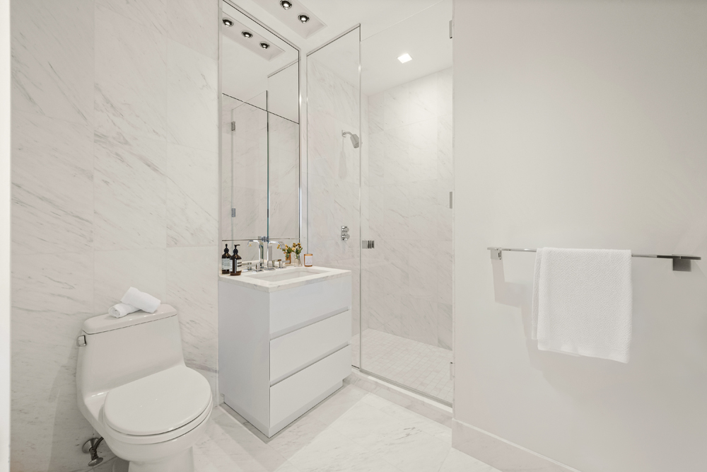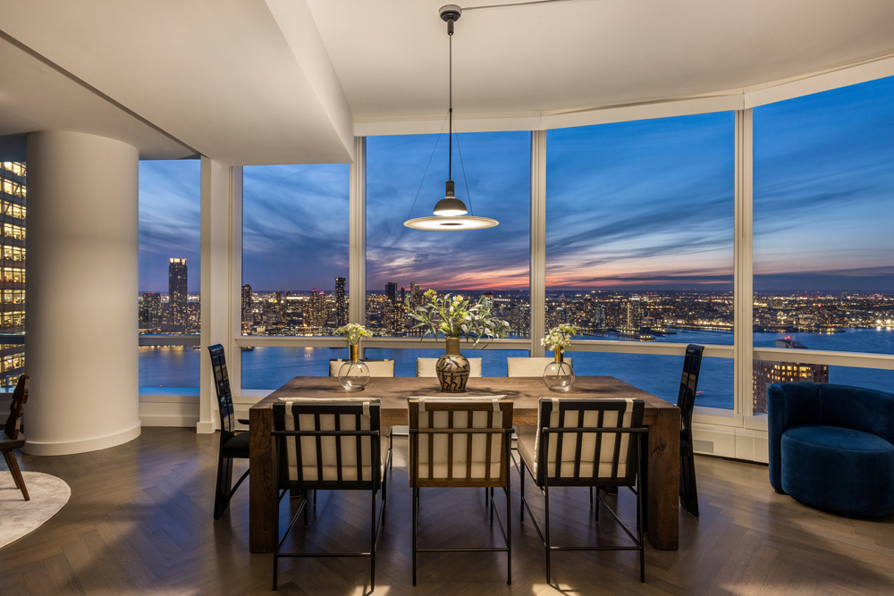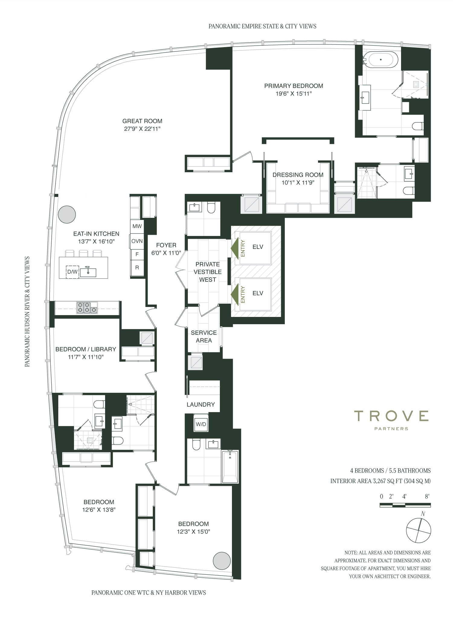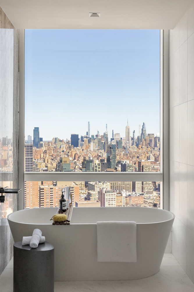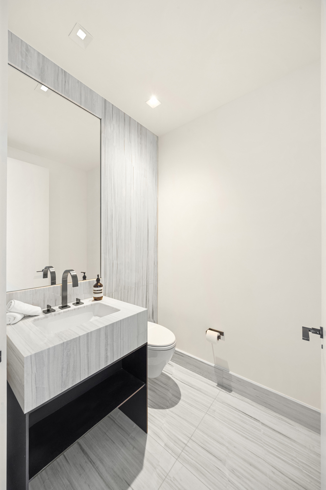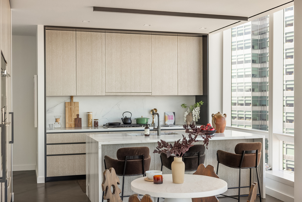 From a private elevator vestibule, a grand set of double doors reveals a formal entry foyer that leads to a breathtaking corner living and dining room. Floor-to-ceiling glass wraps the gentle curve of this sprawling 27’9 × 22’11 space for exceptional natural light and spectacular north- and west-facing vistas. The adjacent eat-in kitchen, with an entire wall of floor-to-ceiling windows, center island breakfast bar, and dual points of entry, allows for seamless entertaining and intimate daily living alike. Meticulously designed by AD100 designer David Mann, the custom Molteni kitchen offers cerused white oak cabinetry trimmed in custom soft black metal, Calacatta Borghini marble island with book-matched waterfall, countertop, and backsplash, Dornbracht fixtures in a custom soft black matte finish, two pantries, and top-of-the-line appliances by Wolf, Miele, and Sub-Zero including a 30-in. refrigerator, 18-in. freezer, 36-in. 5-burner gas cooktop with built-in fully vented hood, integrated dishwasher, wall oven with warming drawer, steam oven, speed oven, wine refrigerator, and integrated coffee system. In the northern wing of the residence for the utmost in privacy and views, the palatial primary bedroom suite offers a substantial dressing room and dual primary his and hers baths, each with radiant heat floors, travertine stone slab feature walls, and custom white marble slab vanity with Dornbracht fittings and fixtures in a custom soft black matte finish. The primary master bath features a freestanding BluStone soaking tub positioned to enjoy open north-facing views through a full-height window. There is also an enormous dressing room, all built out with custom California Closets. At the southern end of the residence, three additional bedrooms, each with en suite bath, including one bedroom gracing the southeast corner for exceptional light and views. A powder room, utility room with washer and vented dryer, and separate service entrance complete this magnificent residence.
