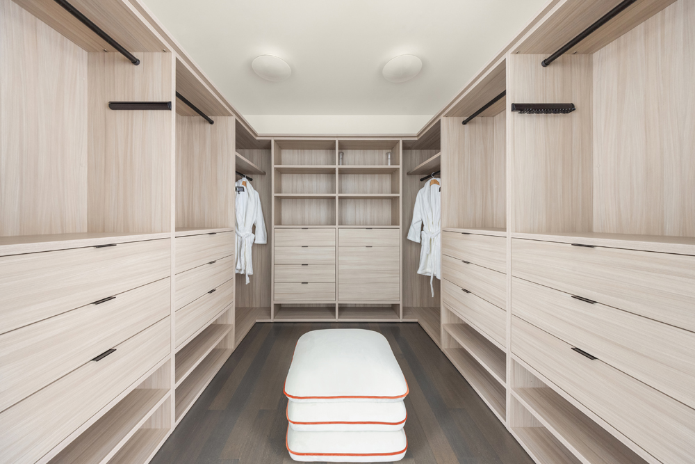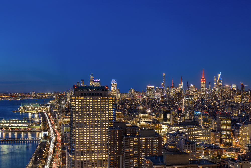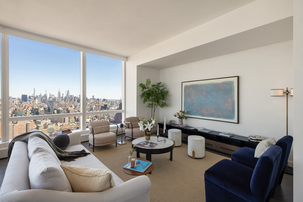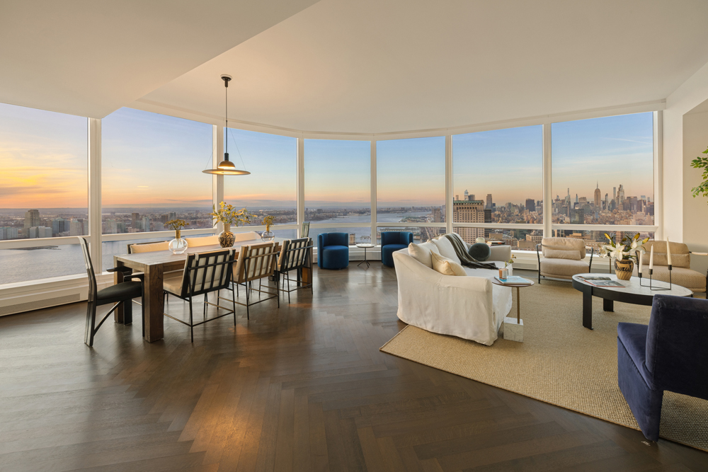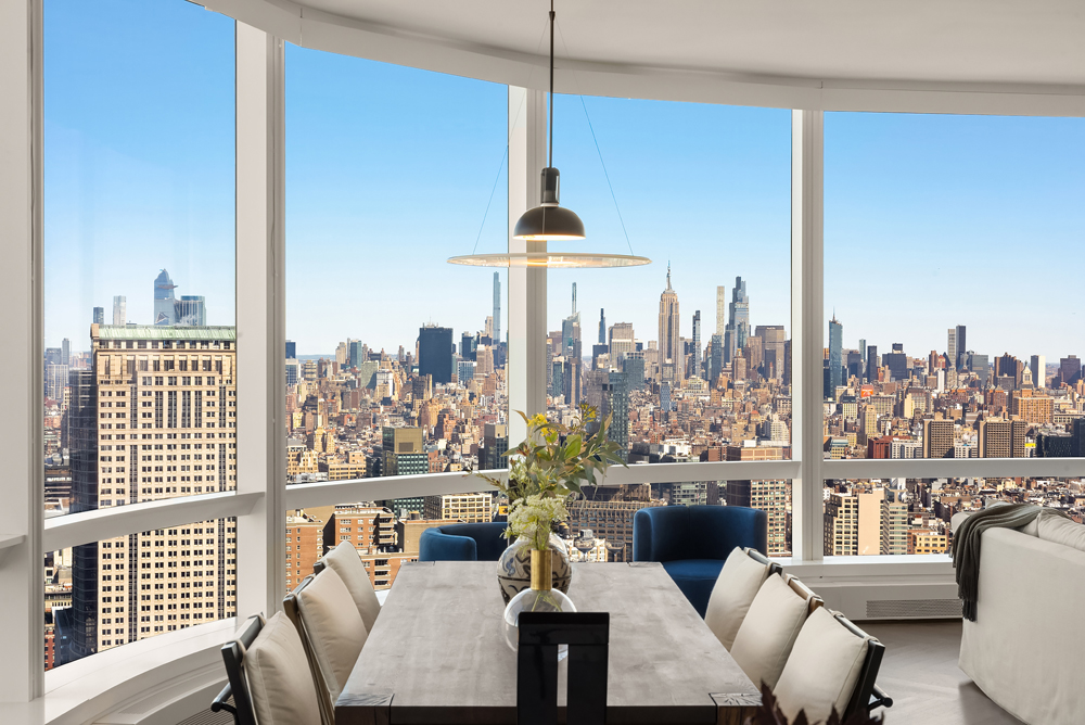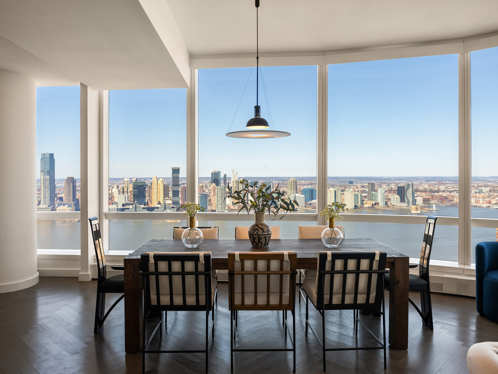 From a private elevator vestibule, a grand set of double doors reveals a formal entry foyer that leads to a breathtaking corner living and dining room. Floor-to-ceiling glass wraps the gentle curve of this sprawling 27’9 × 22’11 space for exceptional natural light and spectacular north- and west-facing vistas. The adjacent eat-in kitchen, with an entire wall of floor-to-ceiling windows, center island breakfast bar, and dual points of entry, allows for seamless entertaining and intimate daily living alike. Meticulously designed by AD100 designer David Mann, the custom Molteni kitchen offers cerused white oak cabinetry trimmed in custom soft black metal, Calacatta Borghini marble island with book-matched waterfall, countertop, and backsplash, Dornbracht fixtures in a custom soft black matte finish, two pantries, and top-of-the-line appliances by Wolf, Miele, and Sub-Zero including a 30-in. refrigerator, 18-in. freezer, 36-in. 5-burner gas cooktop with built-in fully vented hood, integrated dishwasher, wall oven with warming drawer, steam oven, speed oven, wine refrigerator, and integrated coffee system. In the northern wing of the residence for the utmost in privacy and views, the palatial primary bedroom suite offers a substantial dressing room and dual primary his and hers baths, each with radiant heat floors, travertine stone slab feature walls, and custom white marble slab vanity with Dornbracht fittings and fixtures in a custom soft black matte finish. The primary master bath features a freestanding BluStone soaking tub positioned to enjoy open north-facing views through a full-height window. There is also an enormous dressing room, all built out with custom California Closets. At the southern end of the residence, three additional bedrooms, each with en suite bath, including one bedroom gracing the southeast corner for exceptional light and views. A powder room, utility room with washer and vented dryer, and separate service entrance complete this magnificent residence.